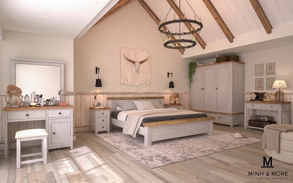 Với thiết kế hướng đến sự tối giản, tông màu trắng làm chủ đạo theo style giả cỗ tạo cảm giác gần gũi, mộc mạc cho không gian. Sự đồng bộ trong từng sản phẩm khiến concept trở nên cao cấp, chỉn chu trong từng chi tiết