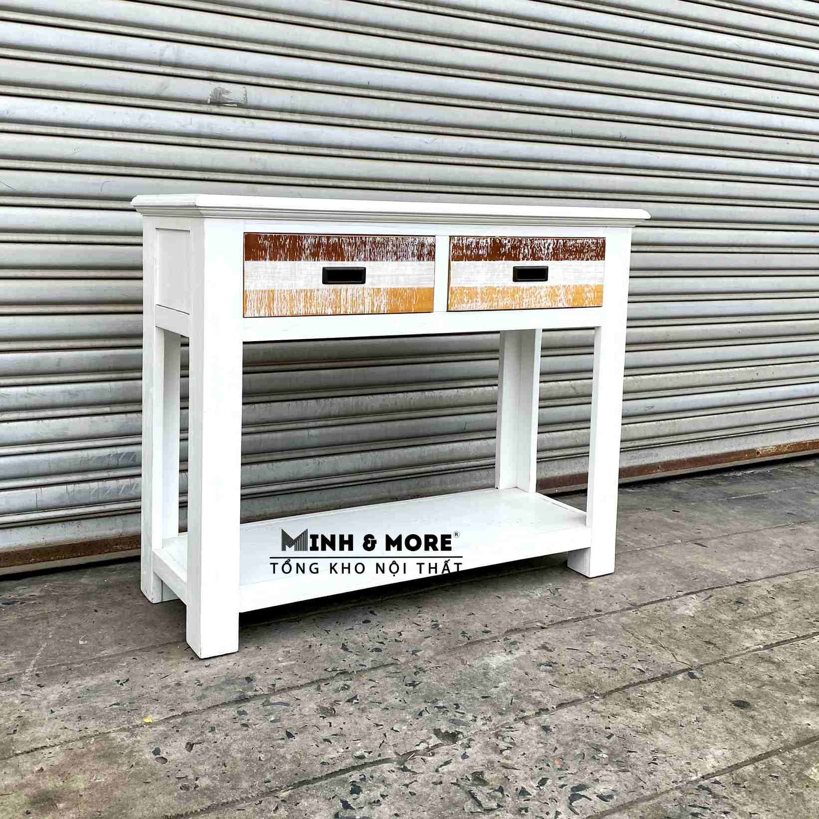 Bàn console MP06 còn có 2 ngăn kéo tiện lợi để các vật dụng nhỏ, và 1 kệ thấp để các vật dụng thường sử dụng như bình nước, sách...,mẫu sản phẩm phù hợp cho các căn hộ hay nhà phố mang phong cách hiện đại. Ngoài ra trên mặt bàn, bạn cũng có thể đặt thêm một số sách báo, tạp chí, khung ảnh hoặc một số vật dụng khác, vừa giúp tận dụng tối đa diện tích sử dụng, vừa tạo điểm nhấn cho căn phòng.