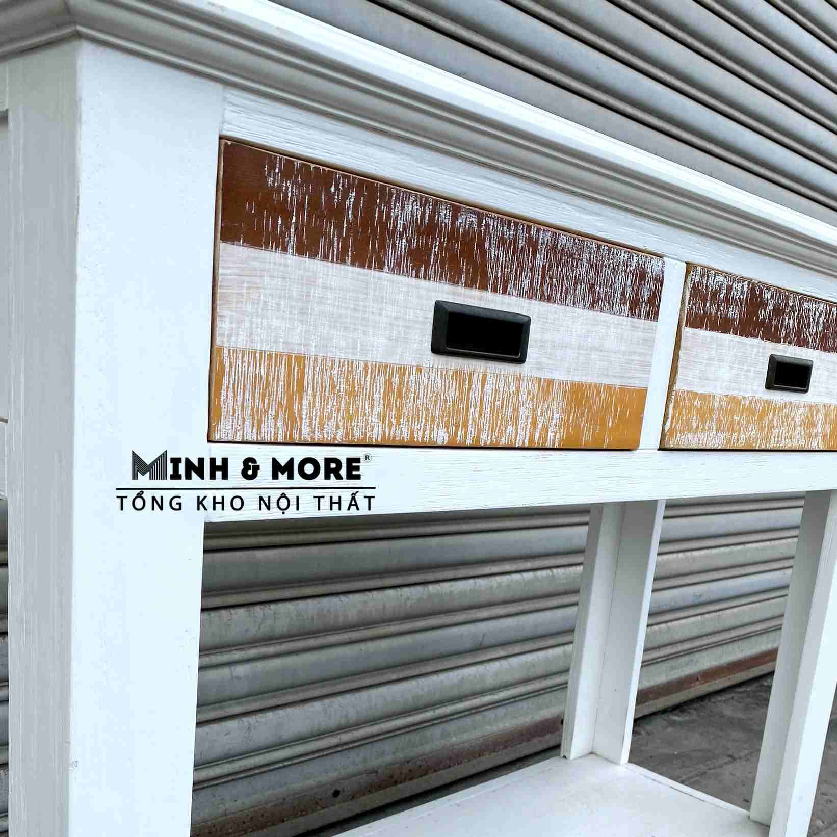 SKU:MO0610Bàn Console MP06 được làm từ gỗ thông nhập với đặc tính nhẹ, bền dễ xử lý và thiết kế, với chất liệu gỗ tự nhiên nên không độc hại với con người và môi trường như những loại gỗ công nghiệp khác. Sản phẩm là sự kết hợp của các gam màu sáng như: trắng, đỏ, vàng, kem với kỹ thuật sơn wash tạo vệt.