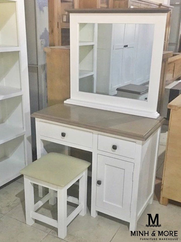 Bộ bàn trang điểm MP04 sẽ giúp phòng ngủ của bạn trở nên sang trọng hơn với màu sắc và phong cách hiện đại. Một bộ bao gồm: bàn trang điểm với các hộc, ngăn kéo để đồ trang điểm và các vật dụng cá nhân, một chiếc gương soi được gắn vào cạnh bàn,có độ rộng gần bằng chiều ngang của bàn, và một chiếc ghế đôn êm ái. Tất cả đều được làm từ gỗ Thông nhập với đặc tính nhẹ, bền dễ xử lý và thiết kế, với chất liệu gỗ tự nhiên nên không độc hại với con người và môi trường như những loại gỗ công nghiệp khác.