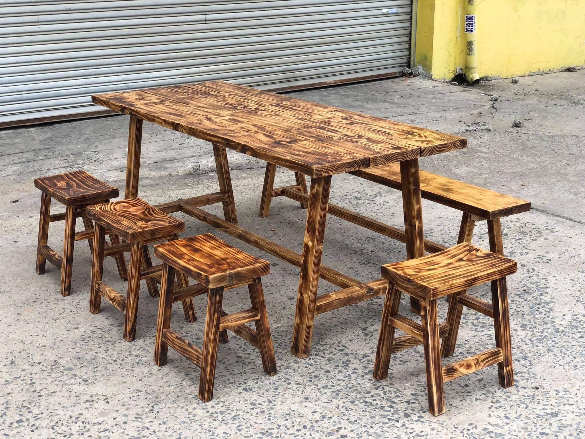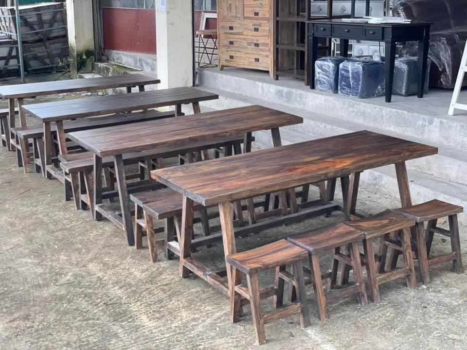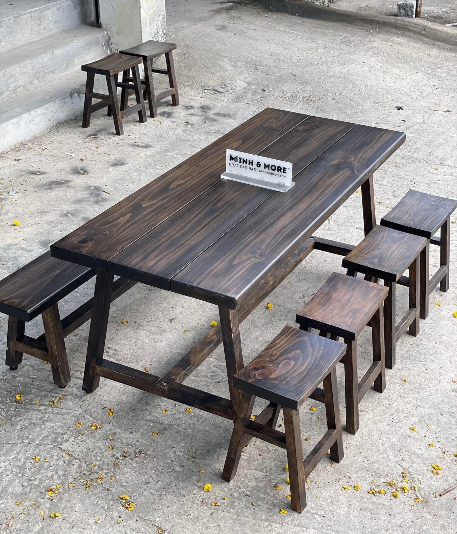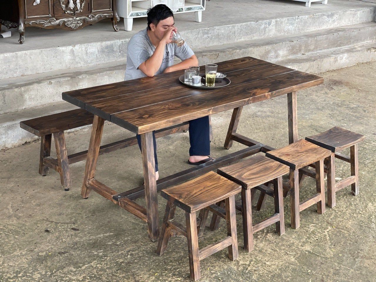 Bộ tiêu chuẩn gồm: 1 Bàn (D180 x R73 x C76 cm, mặt bàn dày 4 cm) + 1 Băng ghế dài + 4 Ghế đôn