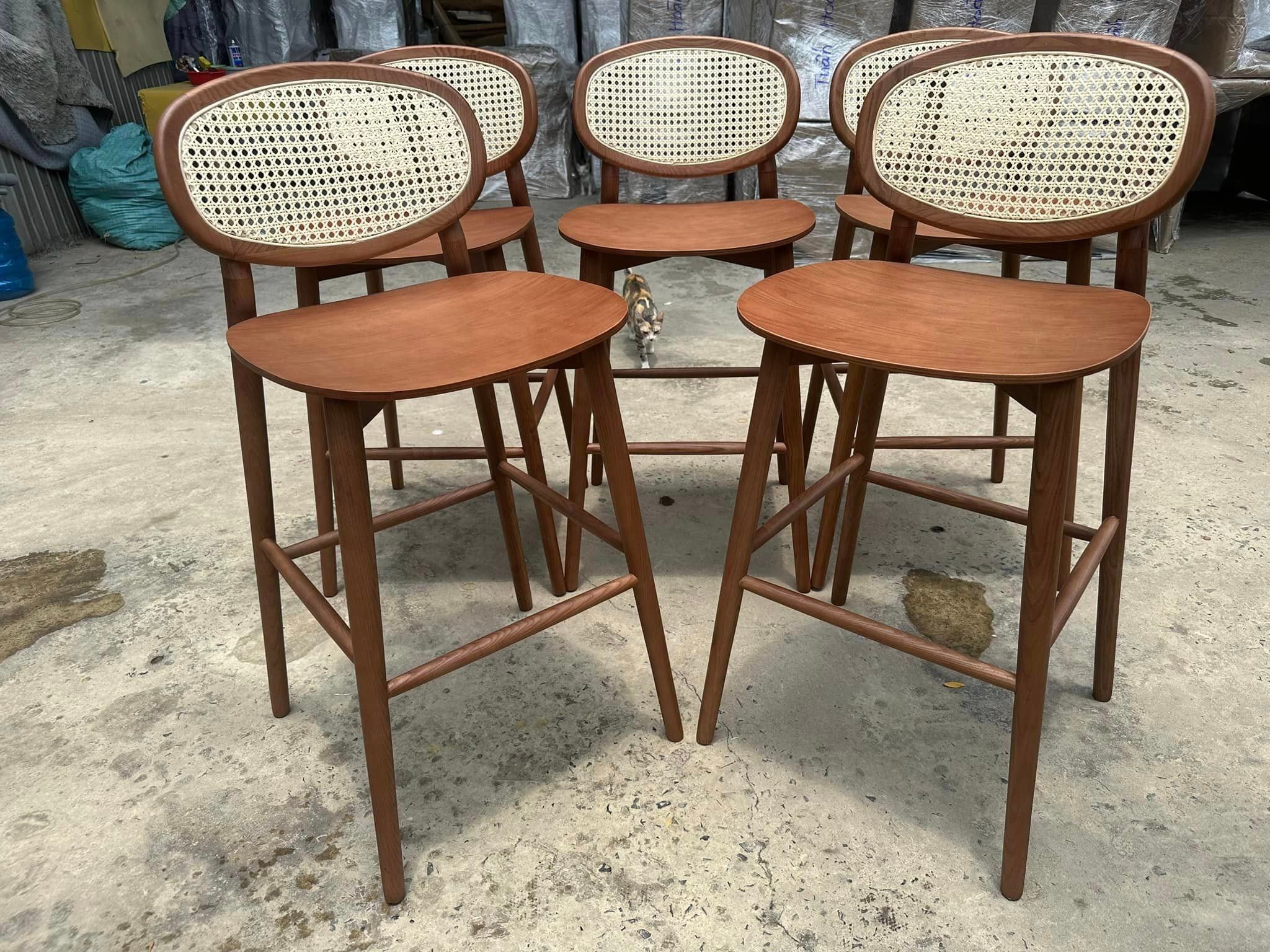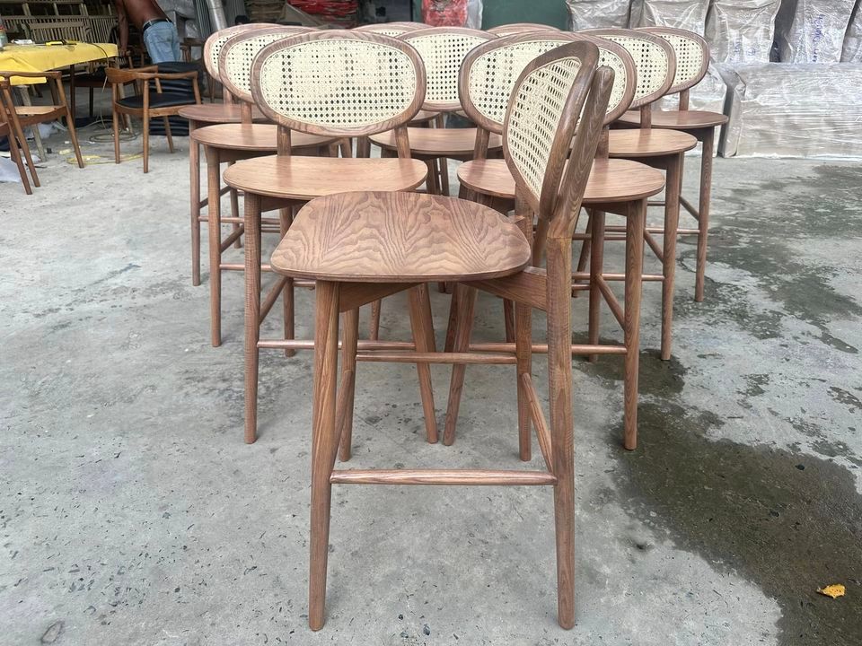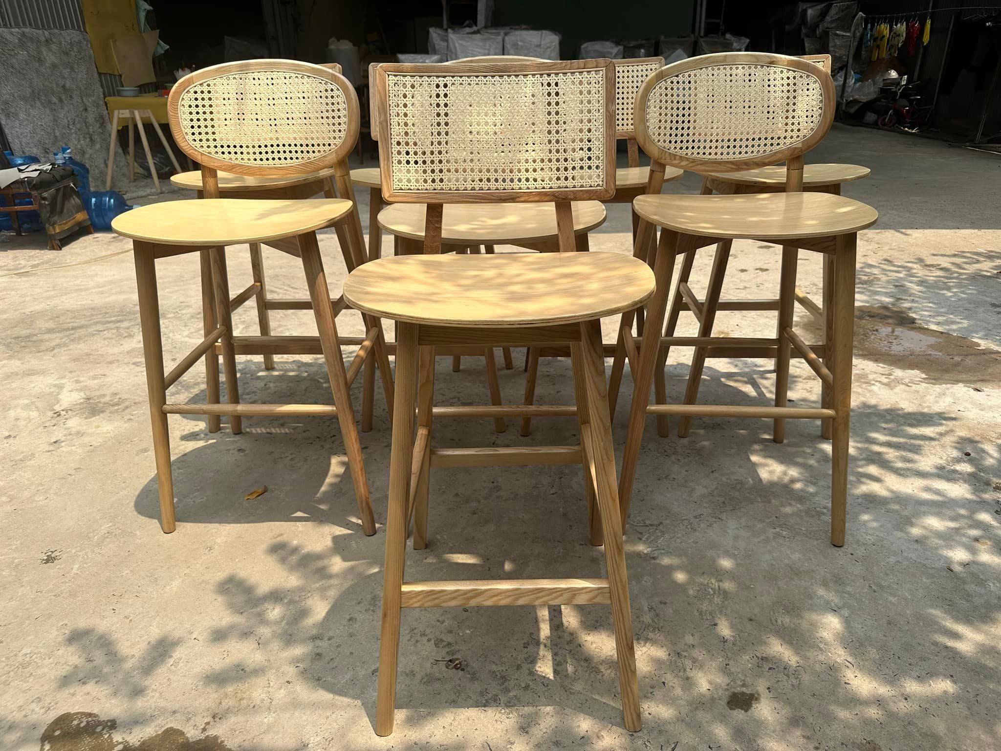 Thiết kế dạng ghế đẩu với khung gỗ ash cùng các đường vân gỗ đẹp mắt, tựa lưng bo tròn, lưng vuông kết hợp với mây mắt cáo.