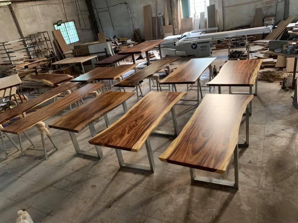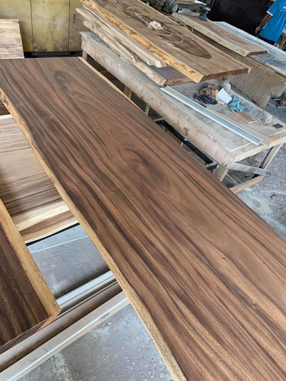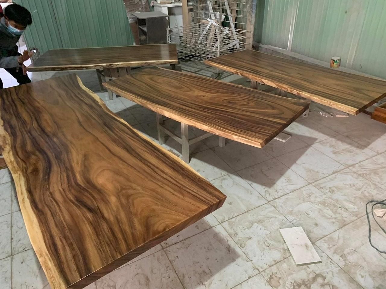 - Mặt bàn gỗ Me Tây với thân tạo 2 viền mặt bàn tự nhiên hoặc rong vuông nếu muốn. Vân Me Tây thuộc loại đẹp trong các dòng gỗ