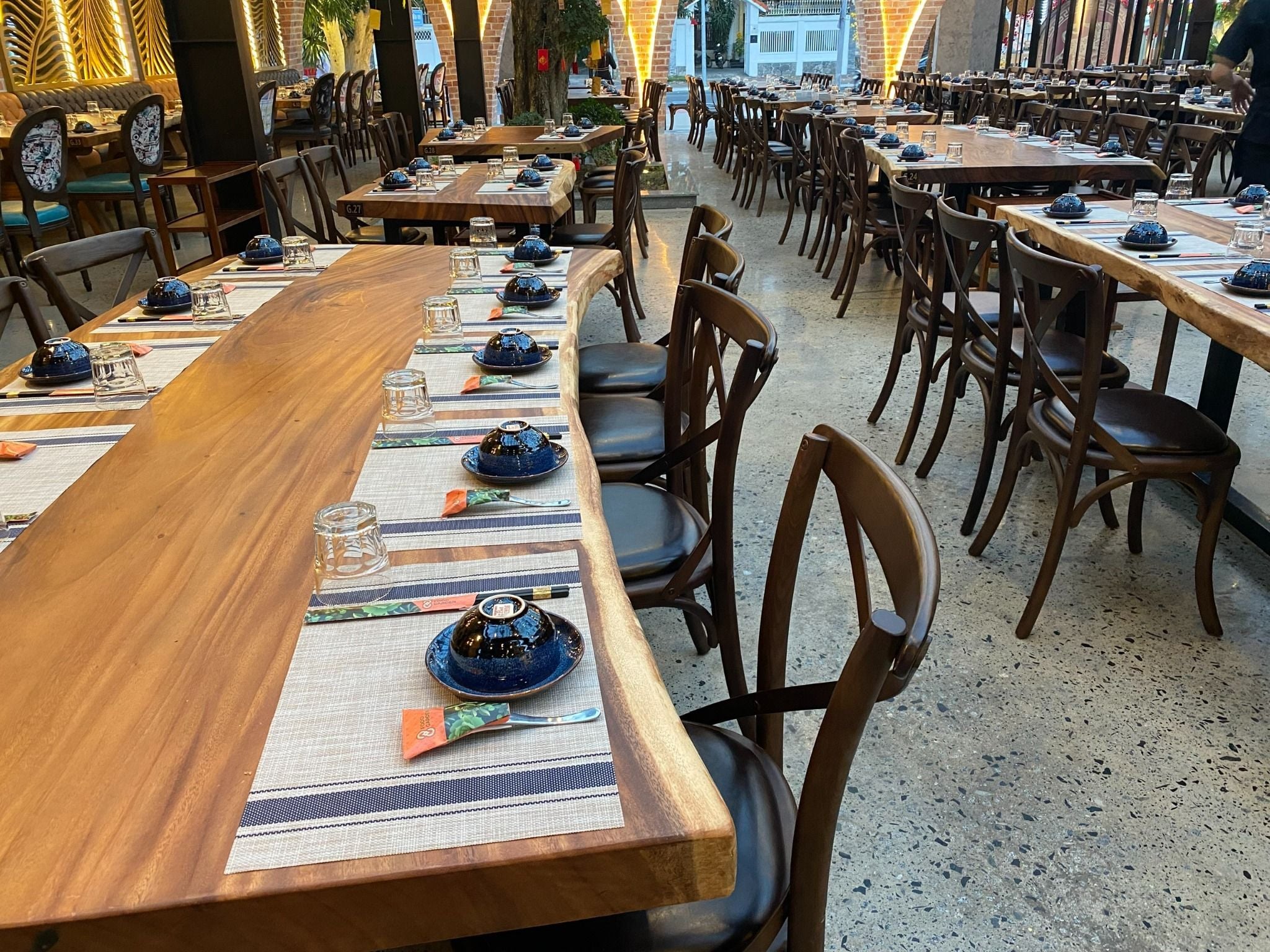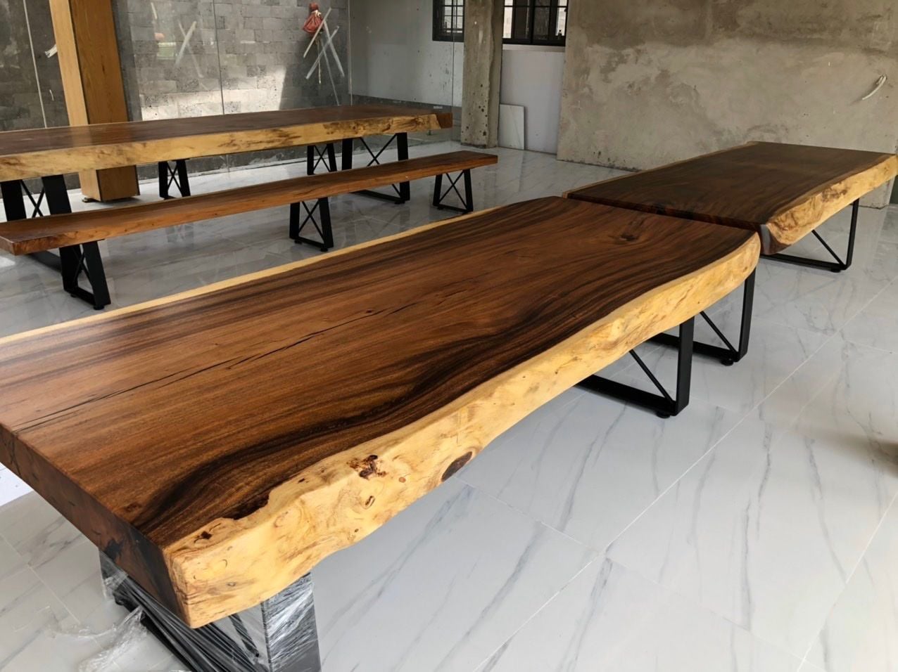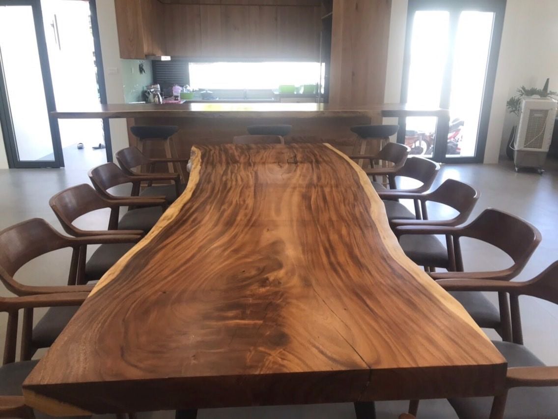 - Mặt bàn gỗ Me Tây với thân tạo 2 viền mặt bàn tự nhiên hoặc rong vuông nếu muốn. Vân Me Tây thuộc loại đẹp trong các dòng gỗ