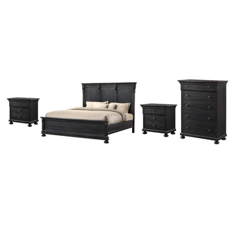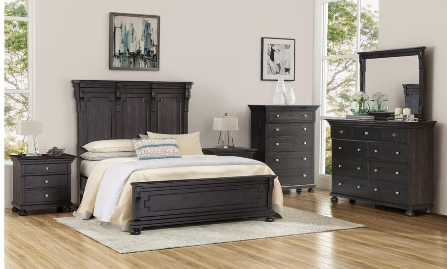- 1 bộ gồm: giường (king hoặc queen tùy chọn) + tab đầu giường + tủ đứng dresser + tủ ngang sideboard + gương.