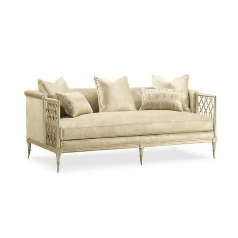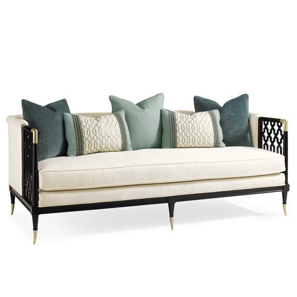 Sofa cao cấp kết hợp khung gỗ Tần bì Ash, điểm nhấn là họa tiết và nẹp kim loại mạ vàng sáng bóng